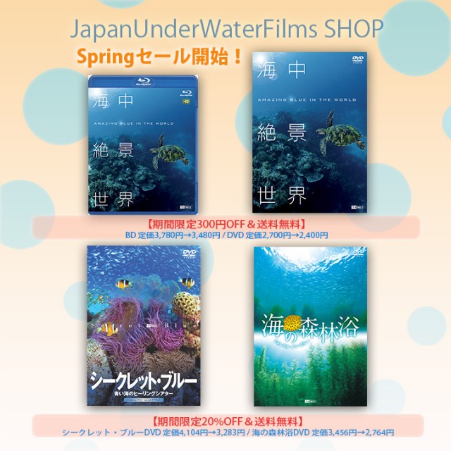 水中映像SHOPより 春のセールのお知らせ 日本水中映像のこだわり映像がぎゅっとつまった4作品。 期間限定のお得価格&送料無料にて販売させていただきます。 JapanUnderwaterFilmsShop(水中映像商店) 「海中絶景世界」のブルーレイ&DVDを