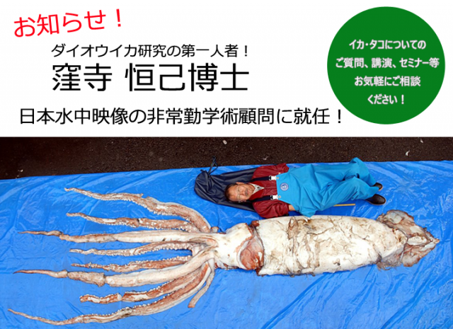 ダイオウイカの窪寺恒己博士が非常勤学術顧問に就任! 国立科学博物館名誉館員の窪寺恒己博士が非常勤学術顧問となりました! ダイオウイカ研究の第一人者である窪寺恒己博士が、この度日本水中映像の非常勤学術顧問となりました。 ダイオウイカをはじめ、頭足類のエキスパートである窪