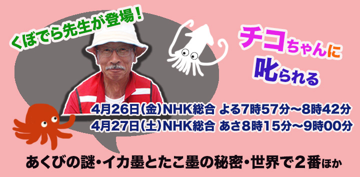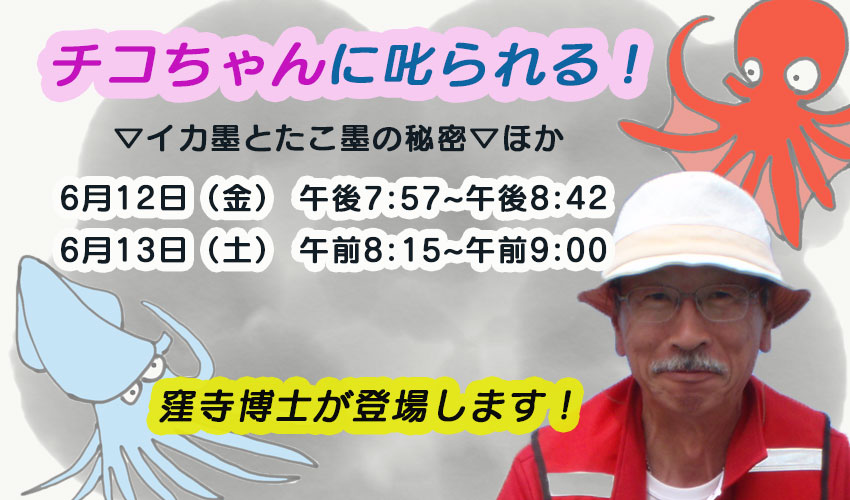 番組放送予定!その1「NHKチコちゃんに叱られる」窪寺先生 登場! NHKの番組「チコちゃんに叱られる」に窪寺先生が登場します!“イカ墨とたこ墨の秘密”について、チコちゃんとどんなお話をするのか?どうぞお楽しみに!!