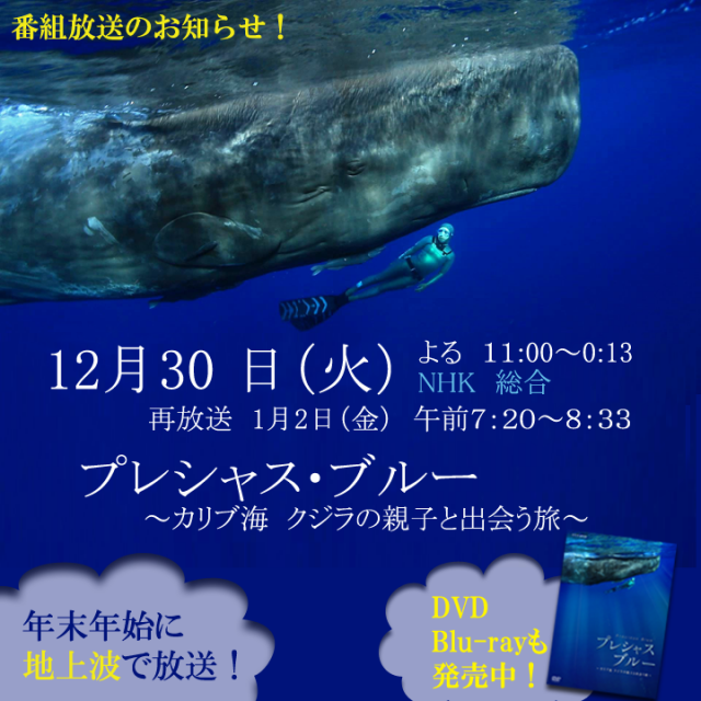 12月30日(火) プレシャスブルー NHK総合にて放送! 番組放送のお知らせです!先日、NHK BSプレミアム ザ・プレミアム で放送された番組が、 年末年始に地上波、NHK総合で放送されます! プレシャス・ブルー ~カリブ海 クジラの親子と出会う旅~ NHK総合 12/3