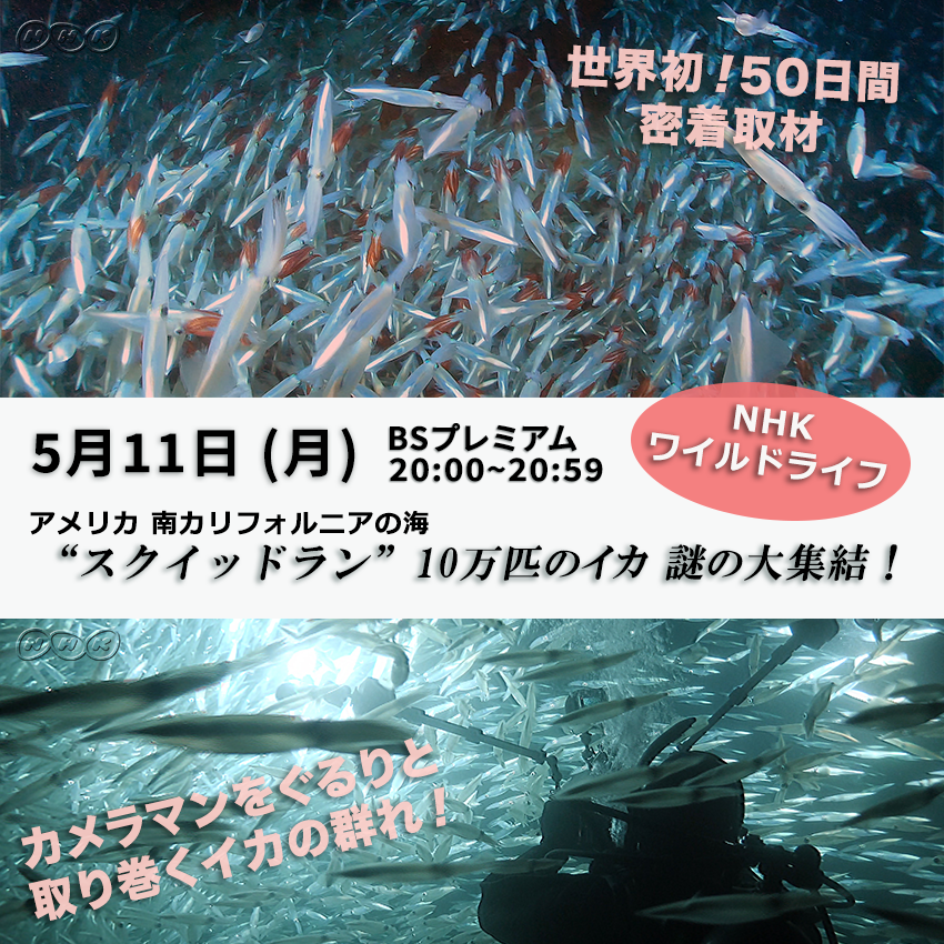 5月11日(月) NHKワイルドライフ「スクイッドラン」放送予定 番組放送のお知らせです!NHK BSプレミアム ワイルドライフ 「アメリカ 南カリフォルニアの海 “スクイッドラン”10万匹のイカ 謎の大集結!」 本放送:5月11日(月)20:00~20:59 再放送:5月18日(