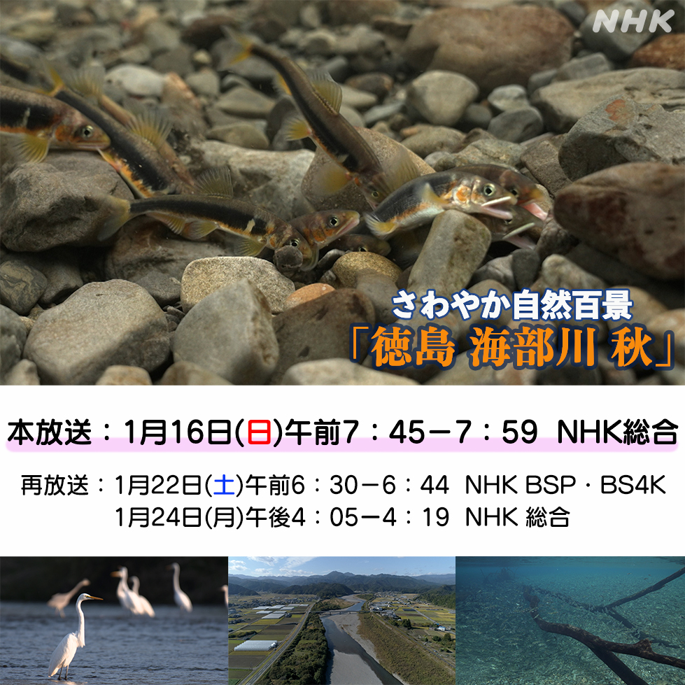 NHK さわやか自然百景「徳島 海部川 秋」放送予定! NHKさわやか自然百景「徳島 海部川 秋」 徳島県の知られざる清流、海部川を取材しました。 秋、産卵のために下流に集まったアユの大群が圧巻です。ぜひご覧下さい!<放送予定> 放送日が新しく変更されました 2022年1月2