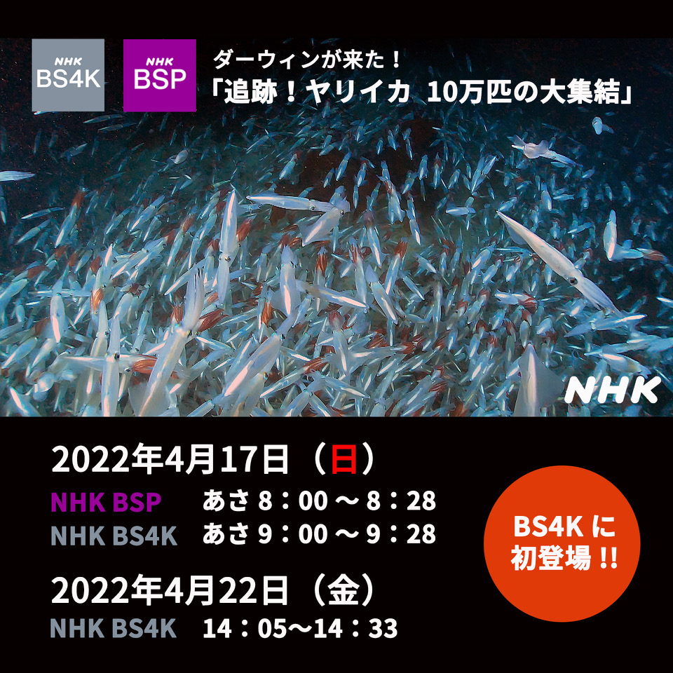 ダーウィンが来た!「スクイッドラン」BS4Kに登場! 【番組放送のお知らせ】アメリカ 南カリフォルニアの浅瀬に10万匹のヤリイカが押し寄せる不思議な現象を密着取材! イカはなぜ大集結するのでしょうか??ダーウィンが来た!「追跡!ヤリイカ 10万匹の大集結」2022年4月