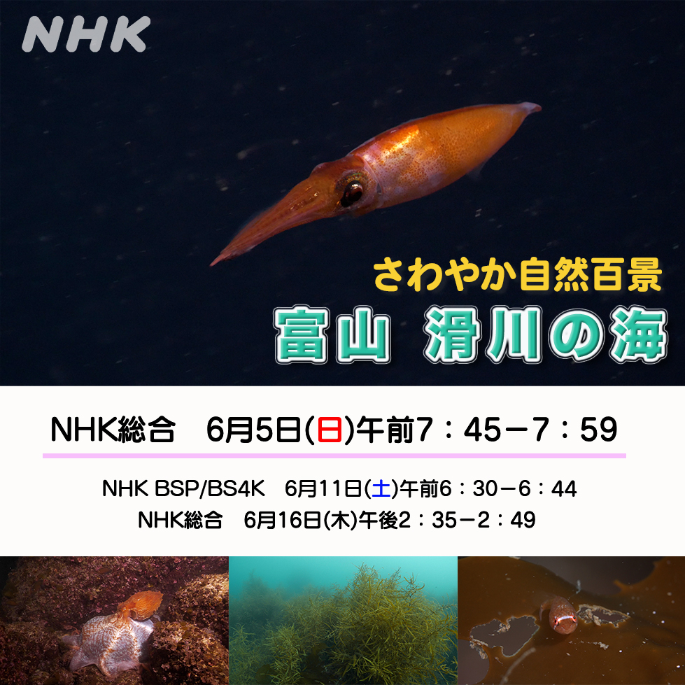 さわやか自然百景「富山 滑川の海」放送のお知らせ! 今回の舞台は、ホタルイカで有名な富山県滑川です。 撮影に訪れたのは春!…と言っても、水温10℃のよく冷えた海です。 スーパーガイドの海遊・木村さんの案内で、色々な生きもの達に出会いました。 日曜日の朝、さわやかな海の映
