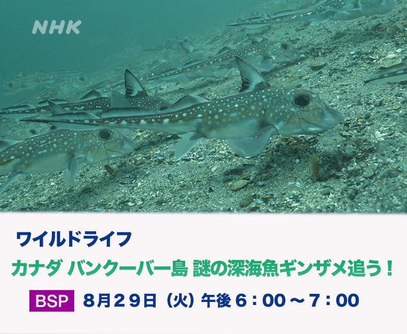 NHK BSP ワイルドライフ選「カナダバンクーバー島 謎の深海魚を追う!」 再放送 カナダの海で、謎の深海魚ギンザメの仲間に密着取材した番組が、BS4Kで再放送されます。オスにある謎の器官の役割とは? 是非ご覧下さい! ワイルドライフ選「カナダ バンクーバー島 謎の深海魚を追う!」8月29日(月) NH