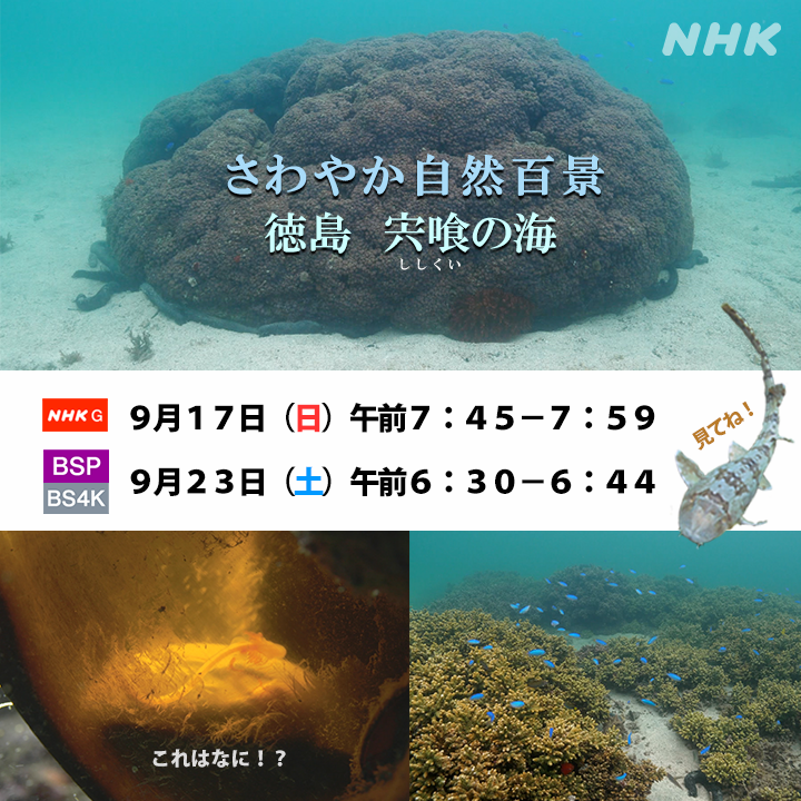 NHKさわやか自然百景「徳島 宍喰の海」放送のお知らせ! 番組放送のお知らせ! NHK さわやか自然百景「徳島 宍喰の海」 9月17日(日)午前7:45−7:59 総合 9月23日(土)午前6:30−6:44 BSP・BS4K 番組HP:https://www.nhk.jp/